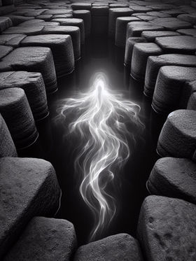 Inspired by a common photographic exercise creating images in the style of a master photographer these AI-generated works reinterpret a visual theme drawn from Minor White’s Easter Sunday. Each variation explores the core concept of a spirit-like presence emerging from darkness, surrounded by stones, echoing the original photograph’s symbolic depth. White created the original image during a period of serious illness, intuitively responding to a scene that reflected his inner state.